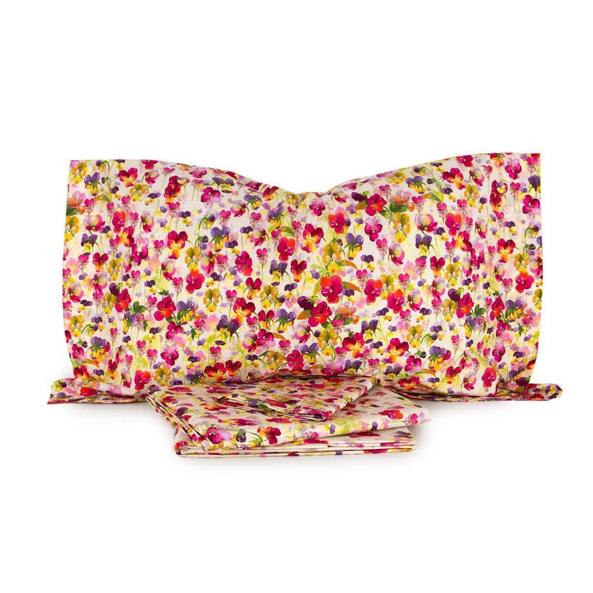 Il set letto è composto da lenzuolo copriletto piatto, lenzuolo con angoli e una fodera a tre volant.