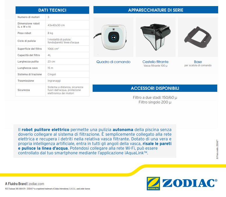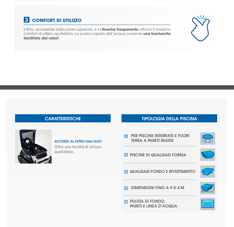 Il suo filtro, accessibile dall’alto, consente un reale comfort nell’uso quotidiano. Lo scarico rapido dell’acqua facilita la rimozione del robot dalla piscina.