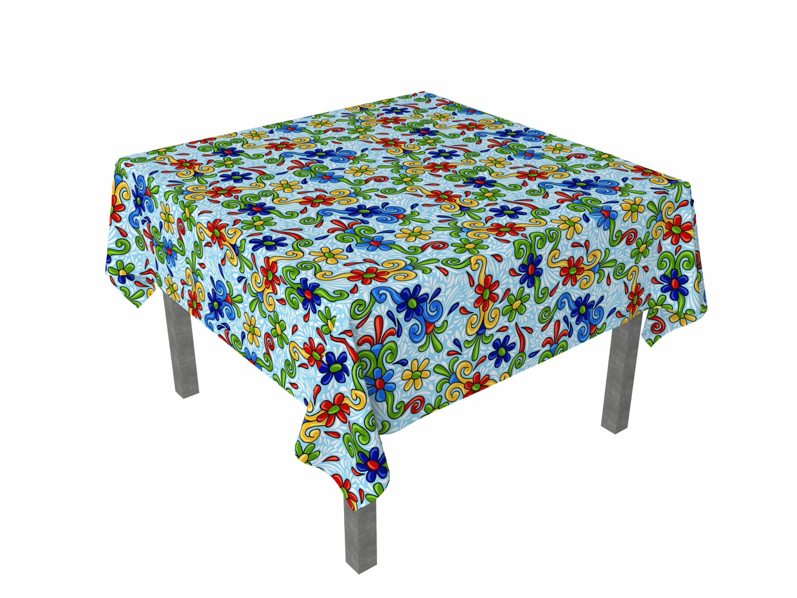 Tovaglia con sfondo azzurro, con raffigurati fiori e greche di diversi colori